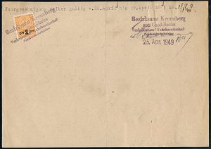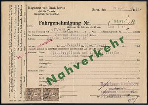 3967 | 25 € | GESCHICHTE VON BERLIN : BERLIN 1949 (18.1.) orig. Fahrgenehmigung "Magistrat von Groß-Berlin Hauptfahrbereitschaft" (Format A5) div. Fiskalmarken (Entwertung Bez.Amt Kreuzbg.) + Zudruck: "Nahverkehr" + 1L: Sonn-u. feiertags ungültig aus der Luftbrückenzeit! | ![]() ![]() | |