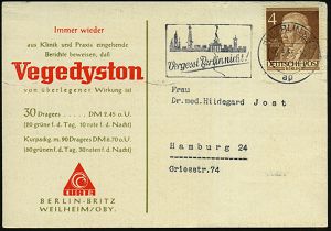 3977 | 18 € | GESCHICHTE VON BERLIN : (1) BERLIN SW 11/ ap/ Vergesst Berlin nicht! 1953 (5.5.) MWSt = Brandenburger Tor mit Sektorengrenze (u. Rotes Rathaus, Gedächtniskirche, Funkturm etc) Pharma-Reklame-Kt.: VegedystonCURTA Berlin-Britz n. Hamburg (Bo.568 A I) | ![]() ![]() | |