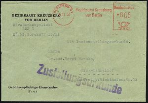 3979 | 14 € | GESCHICHTE VON BERLIN : BERLIN SW 61/ Bezirksamt Kreuzberg.. 1953 (9.11.) AFS Francotyp 065 Pf. + viol. 1L: Zustellungsurkunde , Dienst-Orts-Zustellurkunde der Straßenbaupolizei (Dü.E-20DG) | ![]() | |