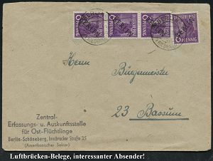 3963 | 30 € | GESCHICHTE VON BERLIN : BERLIN-/ FRIEDENAU 1 1948 (28.9.) 1K-Brücke auf 4x 6 Pf. "Berlin Schwarzaufdruck" (Mi.2, MeF + 24.- EUR) + Abs.-5L: Zentral-/Erfassungs- u. Auskunftsstelle/für Ost-Flüchtlinge/Berlin-Schöneberg.., klar gest. Fern-Bf. via Luftbrücke befördert n. Passau | ![]() | |