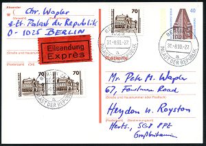 4002 | 20 € | GESCHICHTE VON BERLIN : 1025 BERLIN 25/ a/ PALAST DER REPUBLIK 1990 (31.8.) 1K-Segment = Hauspostamt DDR-Volkskammer auf P 40 Pf. Berlin Chilehaus (P 129) + 3x 70 Pf. VGO (Mi.3348) = Tag der Unterzeichnung Einigungsvertrag (Schäuble, Krause) + entspr. Text, portorichtige Ausl.-Eil-Karte! (+ Color-Kopie Palast der Republik) | ![]() ![]() | |