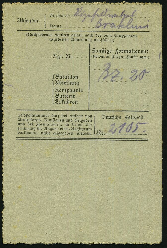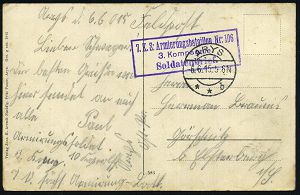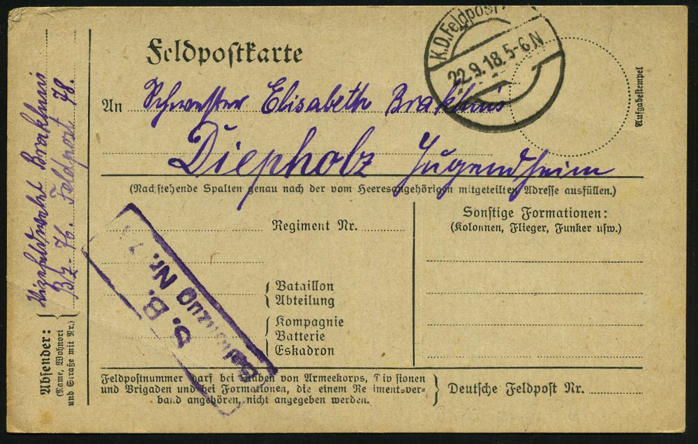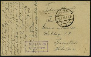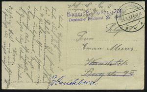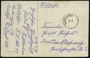 519 | 18 € | I. WELTKRIEG: BALLON / BALLON-FELDPOST : DEUTSCHES REICH 1918 (22.9.) aptierte 1K-Brücke: K. D. Feldpost = Tarnstempel + viol. Ra.2: .. Ballonzug Nr. 76 + hs. Abs.: ".. Bz 76. Feldpost 78" (Frankreich) relativ späte Feldpost-Kt. n. Diepholz | ![]() | |