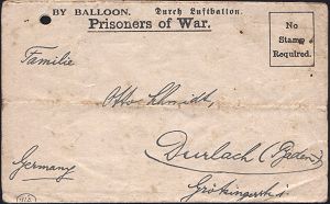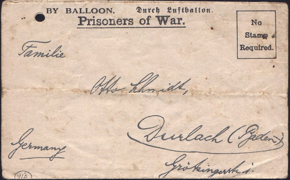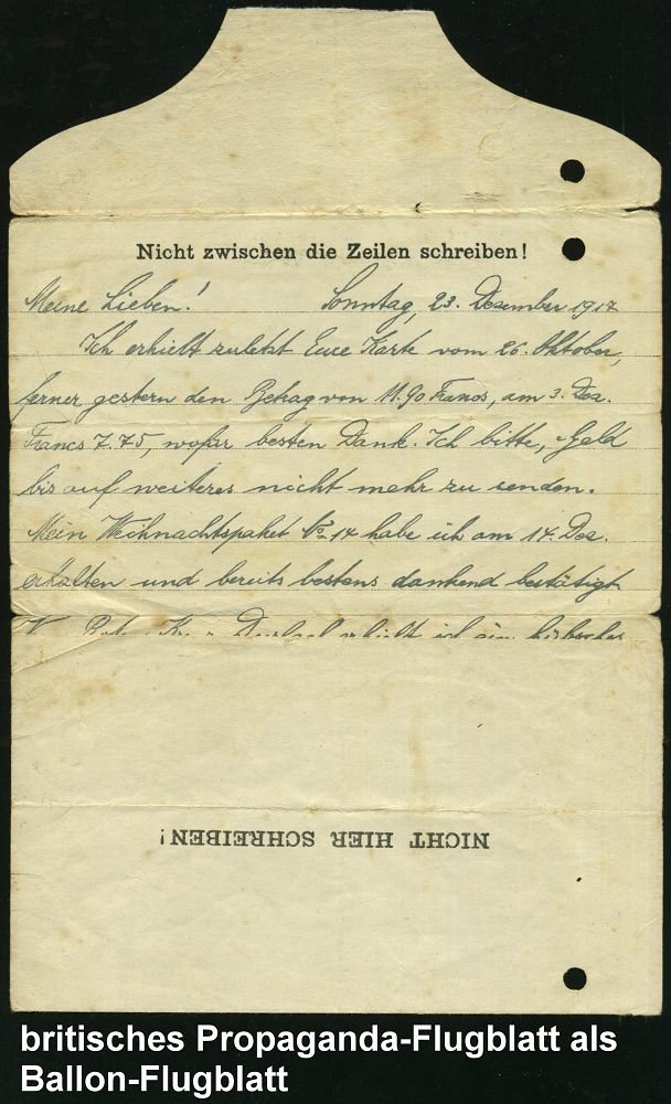 521 | 50 € | I. WELTKRIEG: BALLON / BALLON-FELDPOST : GROSSBRITANNIEN / DEUTSCHES REICH 1917 britische Propaganda-Fälschung eines Kriegsgef.-Faltbriefs "BY BALLOON Durch Luftballon" (mit Lochung für Transportfaden) faksimil. Text, mit Propaganda-Ballon hinter die deutschen Linien befördert! (gefaltet) seltenes Kriegs-Dokument! mit Durlacher Adresse!, sehr selten! | ![]() ![]() | |