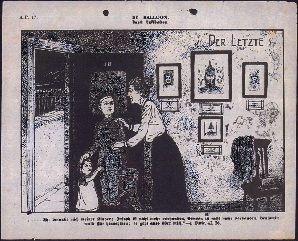 522 | 75 € | I. WELTKRIEG: BALLON / BALLON-FELDPOST : GROSSBRITANNIEN / DEUTSCHES REICH 1917 anti-deutsches Ballon-Propaganda-Flugblatt "BY BALLOON, Durch Luftballon": "DER LETZTE" = letzter Sohn zieht in den Krieg, Trauerbilder der Gefallenen Moses-Zitat: "Jhr beraubt mich meinder Kinder.." (Bilder gefallener Söhne u. des Vaters) Randlochung (2x kl. Durchstich) in deutscher Sprache, gute Erhaltung, Seidenpapier!, sehr selten! (Druckvermerkk A. P. 17.) | ![]() | |