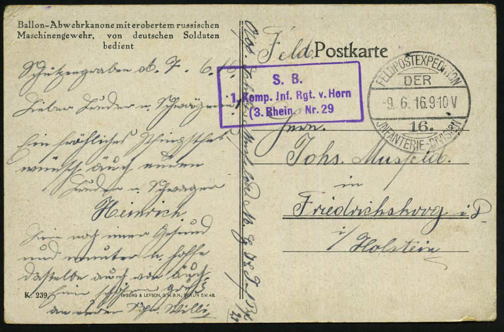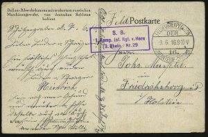 513 | 15 € | I. WELTKRIEG: BALLON / BALLON-FELDPOST : DEUTSCHES REICH 1916 (9.6.) seltene 1K-Brücke: FELDPOSTEXPEDITION/DER/16./JNFANTERIE-DIVISION (Nr.551) + viol. Ra.3: .. 1. Komp. Jnf. Rgt. v. Horn/(3. Rhein.) Nr. 29 , klar gest. s/w.-Feldpost-Foto-Ak.: Ballon-Abwehr mit erobertem russ. Maschinengewehr Typ "Maxim" (Uhv. Imberg & Lefson, Berlin SW.48) n. Friedrichskoog | ![]() ![]() | |