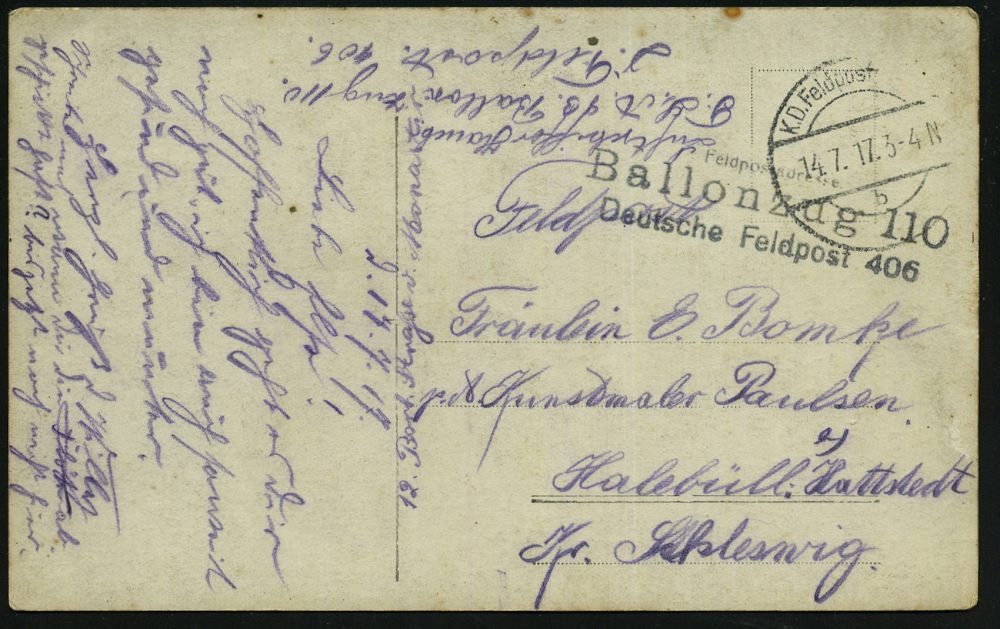 515 | 18 € | I. WELTKRIEG: BALLON / BALLON-FELDPOST : DEUTSCHES REICH 1917 (14.7.) aptierte 1K-Brücke: K. D. Feldpost/b = Tarnstempel + schw. 3L: .. B a l l o n z u g 1 1 0 / Deutsche Feldpost 406 + hs. Abs., individuelle s/w.-Feldpost-Ak.: Vormarsch-Straße mit deutschen Truppen im Osten n. Hattstedt | ![]() ![]() | |