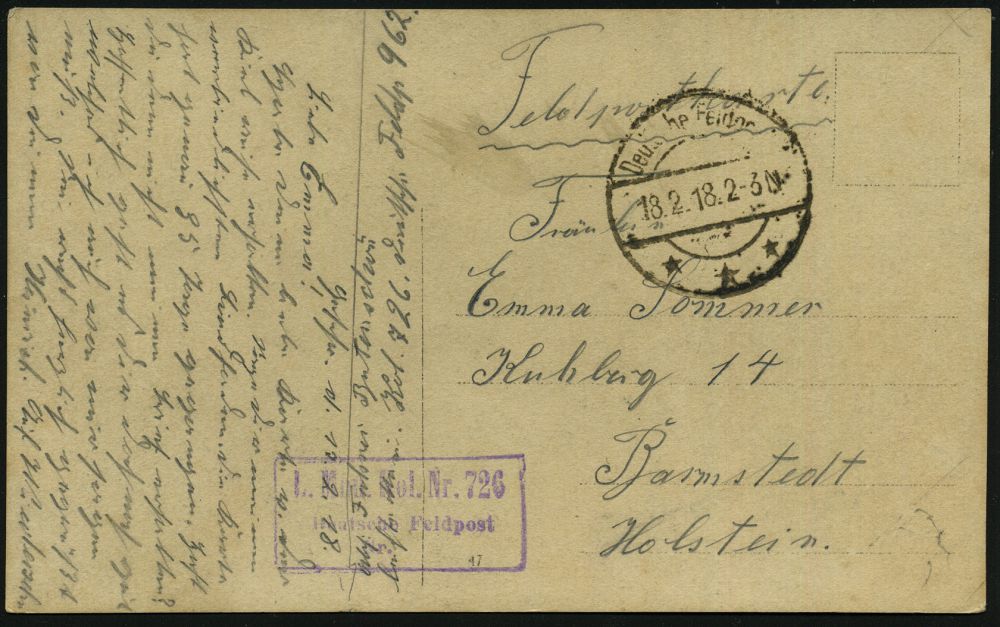 517 | 12 € | I. WELTKRIEG: BALLON / BALLON-FELDPOST : DEUTSCHES REICH 1918 (18.2.) 1K-Brücke: Deutsche Feldpost/*** = Tarnstempel + viol. Ra.3: I. Mun.(itions) Kol.(onne) Nr. 726/Deutsche feldpost/Nr. = ohne + hs. Abs.: ".. Deutsche Feldpost 962", individuelle Feldpost-Foto-Ak.: 2 Geschütze zur Flieger- u. Ballon-Abwehr (in Stellung) n. Bad Bramstedt | ![]() ![]() | |