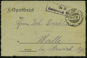 518 | 18 € | I. WELTKRIEG: BALLON / BALLON-FELDPOST : DEUTSCHES REICH 1918 (22.7.) aptierter, bayer. 2K-Gitter: FELD-POST = Tarnstempel + viol. Ra.2: ..B a l l o n z u g Nr. 20 + rs. hs. Abs., kleiner Feldpost-Falt-Bf. mit Inhalt (Frankreich) n. Walle | ![]() ![]() | |